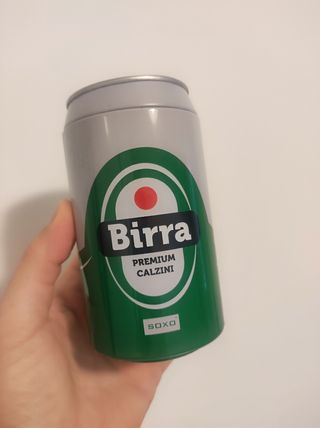 Contenitore con coperchio in latta a forma di lattina di birra. In origine conteneva calzini che non solo presenti, la scatola Ė VUOTA. Il brand é soxo ed é nuova, no difetti. Altezza 11cm