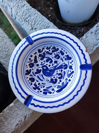 Posacenere e piatto di terracotta Deruta dipinto a mano in blu. Alcune sbeccature evidenziate in foto e una crepa. Realmente vintage. 📏 Cm 12x3H