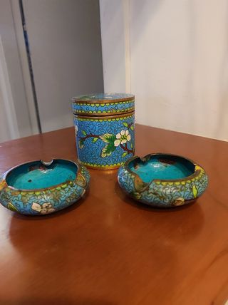Set composto da 2 posacenere e una scatola in ottone laccato blu, con decori floreali e bordi di pregio. Ottime condizioni, il set tuttavia riporta alcuni segni del tempo quali ammaccature, punti rovinati e dove lo smalto si é scrostato, ben visibili dalle foto. Da collezione e di difficile reperimento, il set é di proprietà della nostra famiglia dagli anni '50 del 1900. 📏 Diametro e altezza scatola 8cm 📏 Posacenere con piccola base rientrante di 4cm diametro e diametro totale 9cm ⚖️ Peso totale del set 380gr