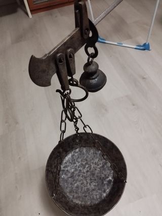 Antica bilancia stadera in ferro, completa di piatto e contrappeso