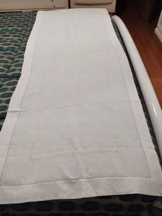 Runner fondoletto antico degli anni '40 in tela tessuta a mano, ricamato a mano, ideale su un cassetto su un tavolo antico. Misura cm 166 x cm 62. Mai usato.