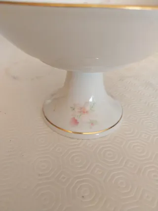 Elegante alzatina in porcellana Limoges, decorata con delicati fiori rosa e foglie verdi. - Bordo dorato. - Motivo floreale dipinto a mano.