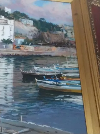 Bellissimo quadretto della Linea Preziosi di Berger, con una scena marina. Misura lunghezza cm 16 Misura altezza cm 22 - Raffigurazione di barche su una spiaggia con un villaggio sullo sfondo. - Firma dell'artista Berger visibile nell'angolo in basso a destra. - Cornice dorata.