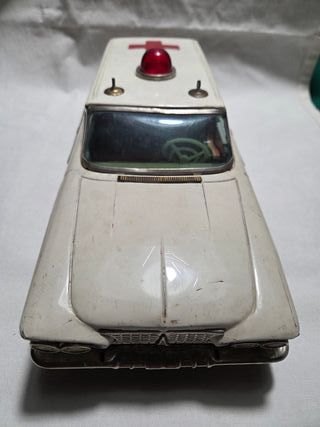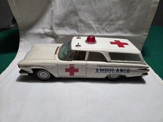 Modellino di ambulanza Plymouth Station Wagon del 1961, prodotto da Ichiko. - Colore bianco con dettagli rossi. - Scritta AMBULANCE blu sul fianco. - Sirena rossa sul tetto funzionante e collegata al movimento delle ruote anteriori