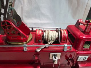 Modellino di camion dei pompieri Ford, prodotto da Bandai. Un pezzo da collezione per gli appassionati. - Materiale: latta - Scala estensibile, avvolgitore con corda e sirena azionata a mano funzionanti - Misure 12 x 14 x 32 cm