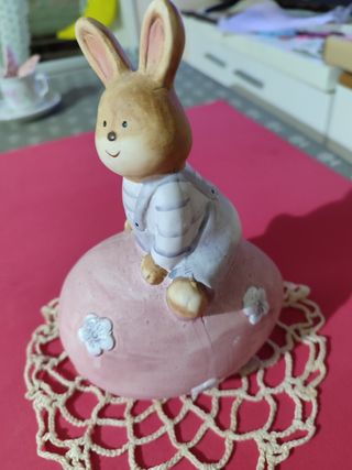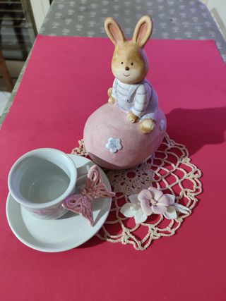 Tazza Tognana con piattino decorato in rosa, decori fiori e farfalla in porcellana rosa, coniglietto pasquale, centrino fatto a mano colore rosa pallido. Adatto come regalo x la prossima Pasqua. Le misure si riferiscono al coniglietto.