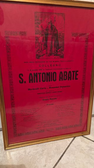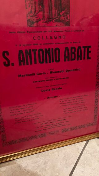 Antica stampa religiosa dedicata a S. Antonio Abate, proveniente dalla Chiesa Parrocchiale di Collegno. - Celebrazione solenne del 18 gennaio 1969. - Illustrazione di S. Antonio Abate. - Nomi dei celebranti e dei musicisti. - Testo di Jenetto e Rosario delle Funzioni.