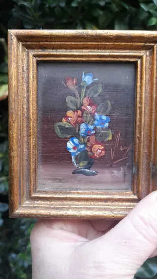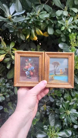 Deliziosa coppia di piccoli dipinti in cornici dorate vintage. Un pezzo unico per aggiungere un tocco d'arte alla tua casa. Segni del tempo passato come mostrano le foto che sono parte integrante della descrizione - Dipinto floreale con vaso. - Paesaggio con albero e casa.