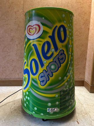 Marca: ISA Branding: Solero (Algida) Tipologia: frigorifero / espositore refrigerato promozionale Struttura: metallo verniciato a forma cilindrica Alimentazione: elettrica Ruote: presenti per spostamento Ideale come oggetto vintage da arredo, bar, negozio o collezione pubblicitaria.