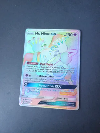 Carta Pokémon GX di Mr. Mime, numero 173/168 dall'espansione Astrale. - Abilità: Pari Magici - Attacco GX: Trucco Vitale GX - Debolezza e Resistenza visibili sulla carta.