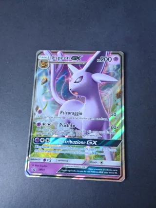 Carta Pokémon Espeon GX, edizione speciale Black Star Promo. - Pokémon: Espeon GX - Tipo: Psico - PS: 200 - Attacco 1: Psicoraggio - Attacco 2: Psichico - Abilità GX: Distribuzione GX - Debolezza: Oscurità x2 - Resistenza: Metallo - Costo di ritirata: 2 - Illustratore: Sban Graphics - Codice carta: SM35