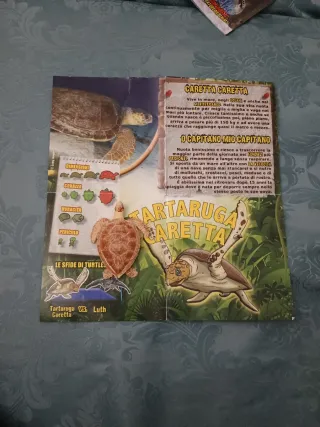 Pagina di rivista con informazioni sulla tartaruga marina Caretta Caretta. - Illustrazioni dettagliate sulla tartaruga. - Testo informativo sulla vita marina e le abitudini della specie. - Sezione dedicata alle sfide tra tartarughe marine.