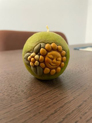 Candela Thun rotonda da collezione, con una simpatica decorazione a tema solare. - Design a forma di sole sorridente e fiori. - Colore verde mela con dettagli colorati. 6cm