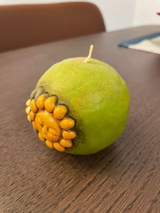 Candela Thun ovale, un pezzo da collezione con un design unico. - Forma ovale distintiva. - Decorazioni a rilievo con sfumature di colore. - Stile moderno ed elegante. 8x6x5cm