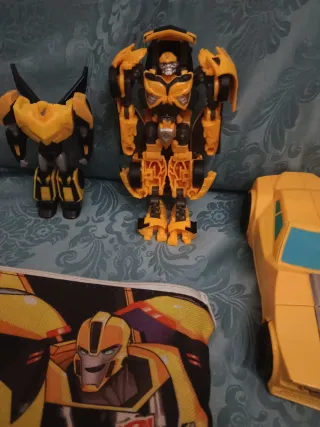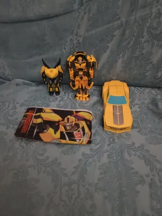 Lotto di giocattoli Transformers con protagonista Bumblebee. Quello più "serio"che si trasforma, c'è il libretto apposito ma sembra strana perché non sono bravo a trasformarla, la macchina invece, quella a destra, non può essere ritrasformata, solo macchina, a quello a sinistra invece si staccano le ali. - Due action figure di Bumblebee. - Una macchinina trasformabile di Bumblebee. - Un astuccio con stampa di Bumblebee.