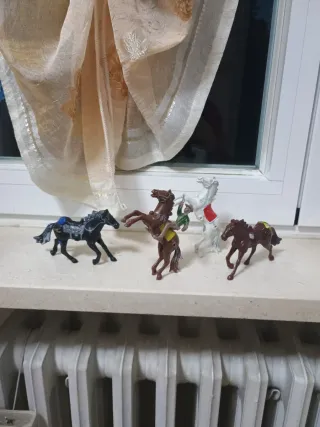 Set di 4 figure di cavalli in stile western vintage. Si attacca a tutti i cavalli - Un cavallo nero con sella blu. - Un cavallo marrone con sella gialla e un cowboy. - Un cavallo bianco con sella rossa. - Un cavallo marrone scuro con sella gialla.