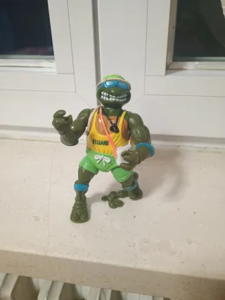 Action figure vintage di Leonardo Tartaruga Ninja in versione Lifeguard. - Action figure del 1992. - Indossa un cappello da lifeguard, occhiali da sole, canottiera gialla con scritta LIFEGUARD e pantaloncini verdi. - Accessori inclusi: salvagente.