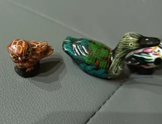 Set di tre piccolissime statuine decorative in legno, raffiguranti un'anatra e due gufetti. - Anatra dipinta con tonalità verdi e blu. - Gufetti decorati con colori vivaci e motivi. - Realizzate in legno intagliato e dipinto a mano. In condizioni pressoché perfette!
