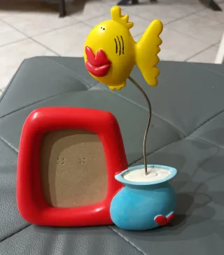 Graziosa cornice portafoto a forma di pesciolino giallo con labbra rosse. - Struttura della cornice in plastica simil ceramica rossa, senza vetro. - Base a forma di vaso blu con un cuore rosso. - Supporto metallico per il pesciolino. In perfetto stato.