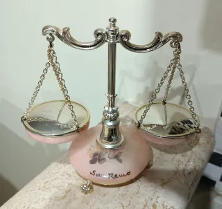 Bilancia decorativa, un Souvenir di Sanremo. Realizzata in multi-materiale, ovvero plastica e metallo dorati e base in Alabastro rosa con decorazioni floreali. - Design elegante e classico. - Ideale come soprammobile o pezzo d'arredo. In ottimo stato conservativo, presenta qualche graffio sui piatti dorati. Bellissimo oggetto decorativo vintage! N.B.: Non è una vera bilancia.