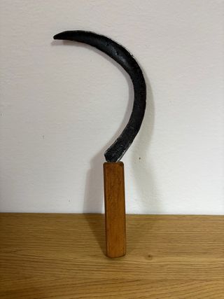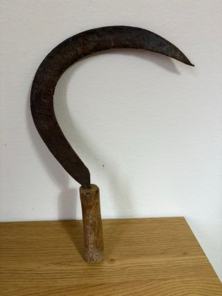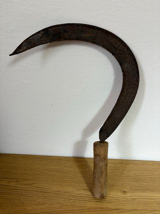 Strumento agricolo: falcetto o falciola in metallo con manico in legno rettangolare. Direi che la funzione principale è decorativa. Per qualsiasi altra cosa scrivimi pure in chat! ☺️
