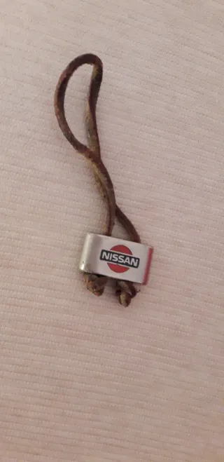 Portachiavi vintage con logo Nissan. - Logo Nissan su placca metallica. - Cordino in cuoio intrecciato.