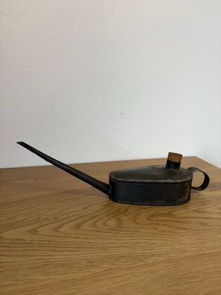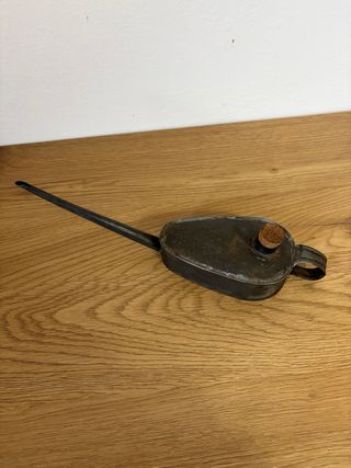 Antico oliatore vintage in lamiera di metallo, tipico attrezzo da officina o per la manutenzione di macchine da cucire/ biciclette dei primi del '900. Forma allungata e manico ad anello, beccuccio extra-lungo e sottile, chiusura con tappo in sughero. Lungo circa 30 cm. Perfetta per collezionisti di attrezzi d’epoca. Per qualsiasi altra cosa scrivimi pure in chat! ☺️