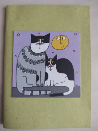 Quadernino taccuino con copertina color verde chiaro e un'illustrazione di due simpatici gatti (bianco, nero, grigio) stilizzati su sfondo viola con sole/luna sorridente. Marchio italiano Arbos in carta 100% riciclata. Sono state usate alcune pagine accuratamente strappate. Totale pagine (facciate) 28. In ottimo stato generale, usato per lo più come soprammobile. Finitura grezza di qualità, made in Italy! ✨ Tags: cartoleria cartolibreria cats sun sunshine lover violet green recycled no waste paper eco friendly vintage retrò utility funny Christmas fun cute purple