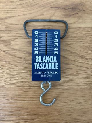 Piccola bilancia tascabile che arriva fino a 5 kg marchiata Alberto Peruzzo editore, con gancio per appendere l'oggetto da pesare. Ottima ad esempio come pesa valige piccole, per pescatori per pesare il pesce pescato etc.