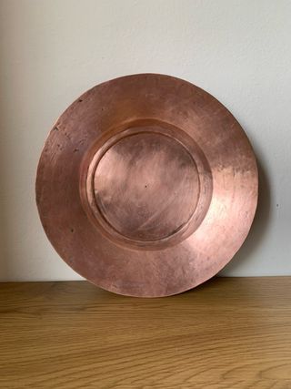 Piatto in rame liscio pesante da appendere grazie al gancio sul retro ma utilizzabile anche come portatrutta, centrotavola, svuotatasche dal design classico e minimalista. Diametro 32 cm, peso 718 grammi. Sul mio profilo altri articoli in rame. Per qualsiasi altra cosa scrivimi pure in chat! ☺️