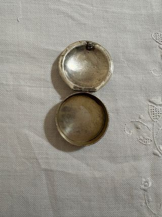 Piccola scatola porta pillole in metallo (secondo me potrebbe essere peltro ma non ne sono certa) dal diametro di 4,5 centimetri. La parte superiore del coperchio presenta un'incisione floreale stilizzata o un motivo geometrico radiale. Pertetto per tenere pillole, piccole monete, perle, o come mini-scatola segreta. Con naturale patina e qualche segno del tempo come da toto (vedi piccole ammaccature sul coperchio). Per qualsiasi altra cosa scrivimi pure in chat! ☺️