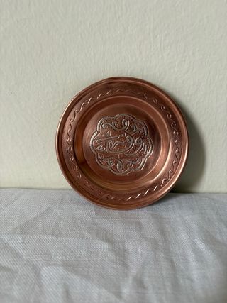 Affascinante e piccolo piattino decorativo in rame in stile orientale finemente decorato con una greca sbalzata lungo il bordo e una scritta o decorazione interna. Ideale come svuotatasche da ingresso, come portagioie da comodino o come piatto da appendere se si aggiunge un piccolo gancio sul retro. Peso 118 grammi, diametro 10,5 cm. Per qualsiasi altra cosa scrivimi pure in chat!☺️