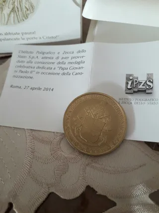 Medaglia celebrativa dedicata a Papa Giovanni Paolo II, completa di scatola e certificato, coniata a Roma 27 aprile 2014 dall'Istituto Poligrafico e Zecca dello Stato (italiano). - Medaglia in ottone. Mm. 34 Davanti c'è il busto del Papa nel 1999, sul retro lo stemna. Nuova Se interessati ad altri oggetti per unico pacco e sconto, cliccate sul mio profilo