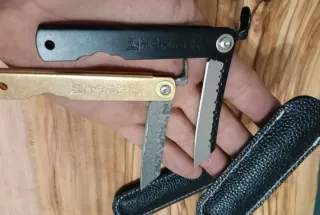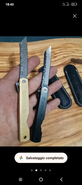 2 Coltellini tradizionali giapponesi con lama pieghevole. Disponibili in due finiture, oro e nero. - Lama in acciaio damasco V10 a strati (oro). - Lama in acciaio ad alto contenuto di carbonio con finitura martellata (nero). - Manico in metallo ripiegato Lama 7.5 cm manico 9.5 cm Totale aperto 17 cm Prezzo per la coppia