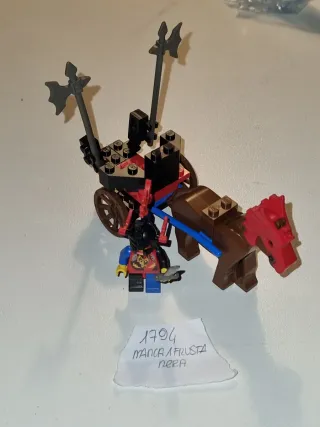 Set LEGO Castello 1794 con cavaliere e carro. Manca 1 frusta nera - Include un cavaliere con armatura e spada. - Carro trainato da un cavallo marrone con criniera rossa. - Due asce da battaglia montate sul carro.