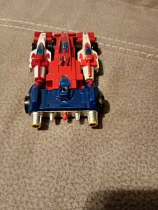 Giocattolo a forma di auto da corsa, con dettagli rossi, bianchi e blu. - Design da auto da corsa. - Numeri 1, 2 e 3 visibili.