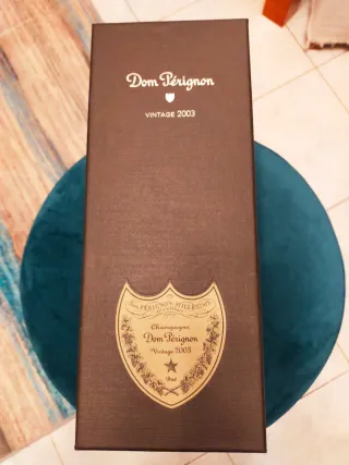 Elegante astuccio per bottiglia di champagne Dom Pérignon. - Modello: Vintage 2003 - Colore: nero - Design con stemma Dom Pérignon -Lievi segni sul dietro e sul lato della scatola,si può notare tutto dalle foto.