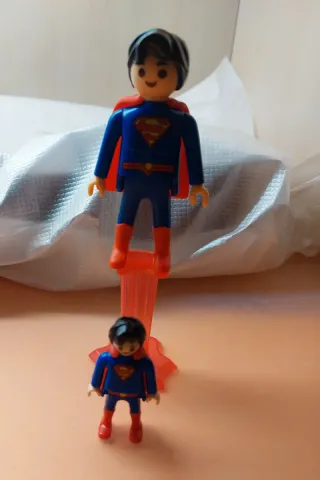 Set di due action figure di Superman Playmobil, una grande e una piccola, provenienti dalle sorprese Kinder. - Action figure di Superman. - Include una figura grande e una piccola. - Provenienti da sorprese Kinder.