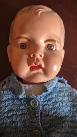 Bambola antica popolare europea in celluloide, risalente agli anni 1920–1935 circa. Altezza: 60 cm (grande formato). Caratteristiche: occhi dipinti capelli dipinti corpo integro, senza crepe strutturali produzione industriale del primo Novecento La bambola conserva abiti originali d’epoca in lana (cardigan e gonnellino), usurati dall’uso, coerenti con l’età. Presente una sola scarpa originale. Sono visibili segni del tempo (bocca scheggiata, usura dei tessuti), non restaurati, a garanzia dell’autenticità. Oggetto interessante per: collezionisti di bambole antiche popolari appassionati di vintage e oggetti storici.