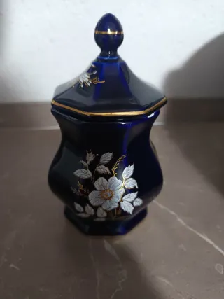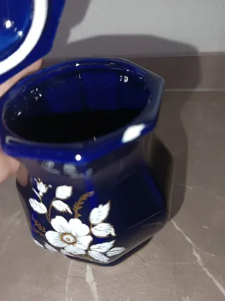 Elegante zuccheriera in ceramica blu, perfetta per aggiungere un tocco di classe alla tua tavola. Presenta delicati decori floreali bianchi e dorati. Ha due piccole scheggiature. - Colore: Blu intenso - Dettagli: Fiori bianchi e dorati - Materiale: Ceramica