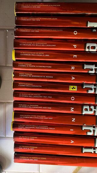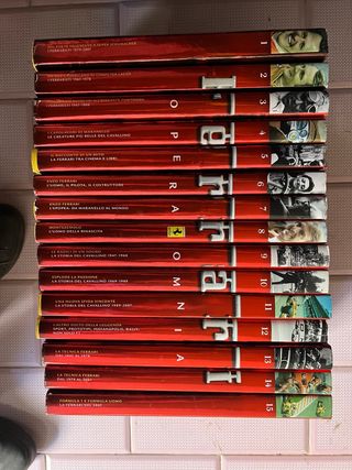 Completa raccolta di 15 volumi sulla storia della Ferrari, che coprono diversi periodi e aspetti del marchio. - Dal Poeta Villeneuve a Super Schumacher (1979-2007) - Da Niki Lauda al Computer Lauda (1961-1978) - Nuvolari all'elegante Hawthorn (1947-1960) - I Capolavori di Maranello - Il Racconto di un Mito: La Ferrari tra Cinema e Libri - Enzo Ferrari: L'Uomo, il Pilota, il Costruttore - Enzo Ferrari: L'Epopea: Da Maranello al Mondo - Montezemolo: L'Uomo della Rinascita - Le Radici di un Sogno: La Storia del Cavallino 1947-1968 - Esplode la Passione: La Storia del Cavallino 1969-1988 - Una Nuova Sfida Vincente: La Storia del Cavall