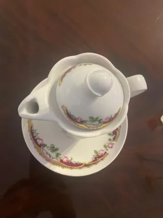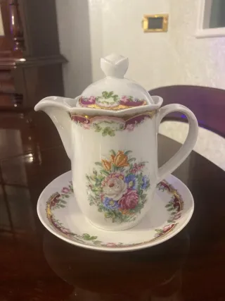 Elegante teiera in porcellana Limoges, finemente decorata a mano con un motivi floreali vivaci e dettagli dorati. Ideale per versare il caffè o il thè. - Decorazione floreale multicolore. - Bordatura con dettagli dorati e bordeaux. - Tappo a forma di bocciolo. - piatto in porcellana con decorazioni floreali e bordatura dorata dipinte a mano