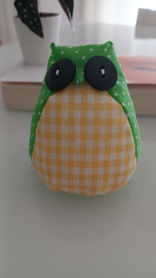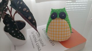 Simpatico gufetto di stoffa realizzato a mano. Corpo in tessuto di cotone a pois bianchi e pancia a quadretti gialli, occhi realizzati con bottoni. Cm 8x8 circa.