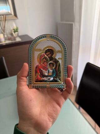 Vendo questa icona religiosa in legno di noce raffigurante la sacra famiglia placcata in argento 99.95, appartenente alla collezione Icons di Valenti & co. L'articolo è nuovo, originale e in condizioni PERFETTE con tanto di certificato!