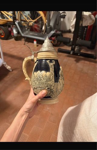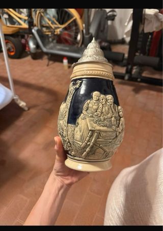 Boccale in ceramica con coperchio in metallo. - Decorazione in rilievo con scena paesaggistica e figure. - Manico lavorato. - Colore blu scuro e beige.