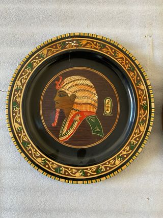 Set di due piatti decorativi in stile egiziano, perfetti per aggiungere un tocco di storia alla tua casa. - Raffigurano profili di faraoni con copricapi tradizionali. - Bordi decorati con motivi geometrici e simboli. - Realizzati con intarsi in legno e dettagli colorati.