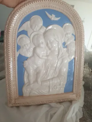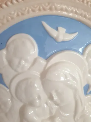 Bellissimo quadro in ceramica artistica originale manifattura italiana DeRuta, raffigurante la Madonna con Bambino e angeli, con cornice decorata. Misure: 23 x 31 cm - Materiale: Ceramica - Colore sfondo: Azzurro - Cornice: Beige con decorazioni