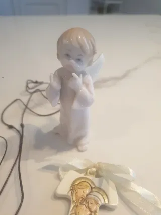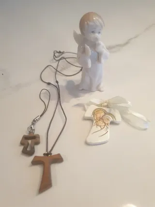 Set composto da 4 pezzi: - Angioletto in ceramica bianca marca Class, con dettagli dorati, altezza 9 cm - Due ciondoli a forma di Tau in legno, uno più grande e uno più piccolo con laccetto. - Il Tau più grande è un ciondolo da collana. - Il Tau più piccolo è un ciondolo per cellulare o portachiavi - Tau raffigurante la Sacra Famiglia