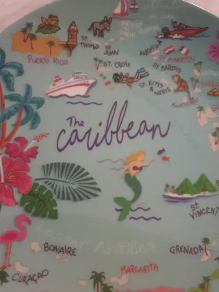 Piatto decorativo con una mappa stilizzata dei Caraibi. Misura 19 cm di diametro - Illustrazioni di isole, barche e fauna marina. - Scritta The Caribbean al centro. - Colori vivaci e design allegro.