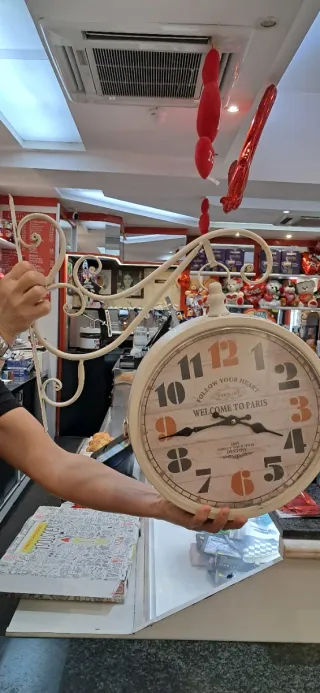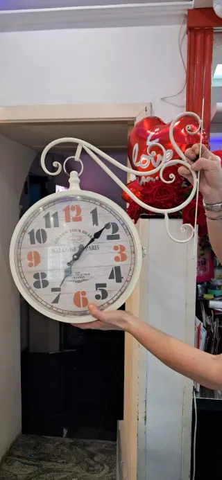 Orologio da parete con un design ispirato a Parigi. Presenta la scritta Follow your heart e Welcome to Paris. - Quadrante con finitura effetto legno. - Numeri e lancette in contrasto. - Cornice esterna chiara. Stile shabby con struttura in metallo e con doppio quadrante Presenta piccoli graffietti sul vetro ma comunque bellissimo